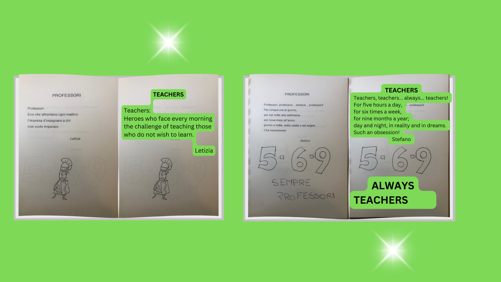 Ester: Yes, the stage translations of Marcovaldo, Anne Frank, and works by Sepulveda were particularly memorable. Sepulveda gave me so much satisfaction because it was the culmination of two years of study, after which the students recreated 'The Story of a Seagull and the Cat who Taught Her to Fly' in comics. Another project that brought me great satisfaction was the creation of a book of poems titled 'Let's Learn by Creating' (‘Impariamo Creando’). The graphic posts scattered throughout this article feature extracts from this very book. Over two years of preparation, we read a lot of Rodari, and I emphasized that a poem could emerge from a single word, without the necessity for rhyme. This resulted in a collection of poems by my students. The goal was to show that even a single word can inspire a poem that resonates. Even though finding the right rhyme can be challenging, and perhaps only the most adept students could manage it, I never dismissed any attempt.